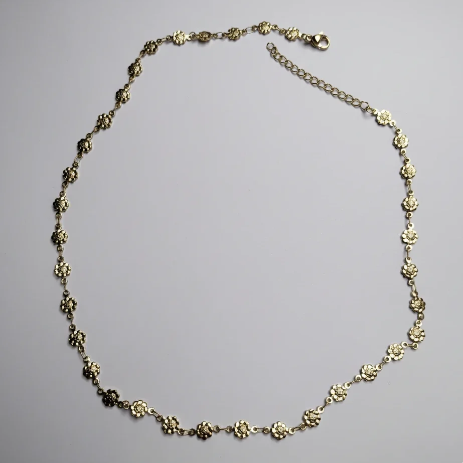 Añade un toque primaveral y romántico a tu cuello con este collar  de diseño continuo. Compuesto por una delicada sucesión de pequeñas flores con detalles grabados, esta pieza destaca por su estilo femenino y su capacidad para iluminar cualquier atuendo con un brillo dorado sutil. Es el accesorio perfecto para llevar solo o combinar en capas con cadenas más largas.